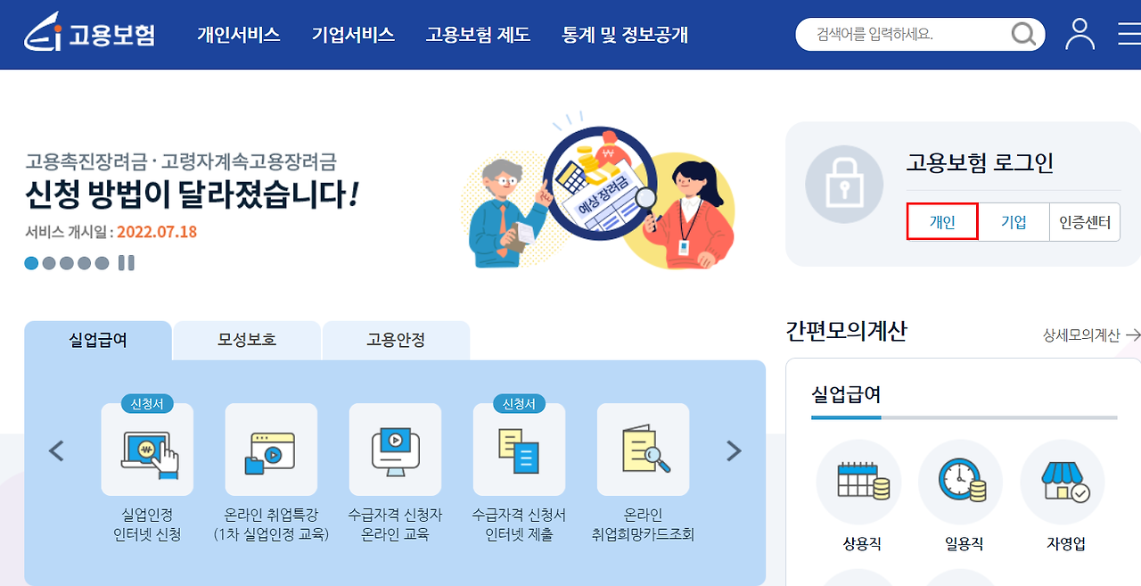 - 서비스 사이트 방문 - 고용보험 관련 웹사이트에 접속하여 개인 로그인을 합니다.